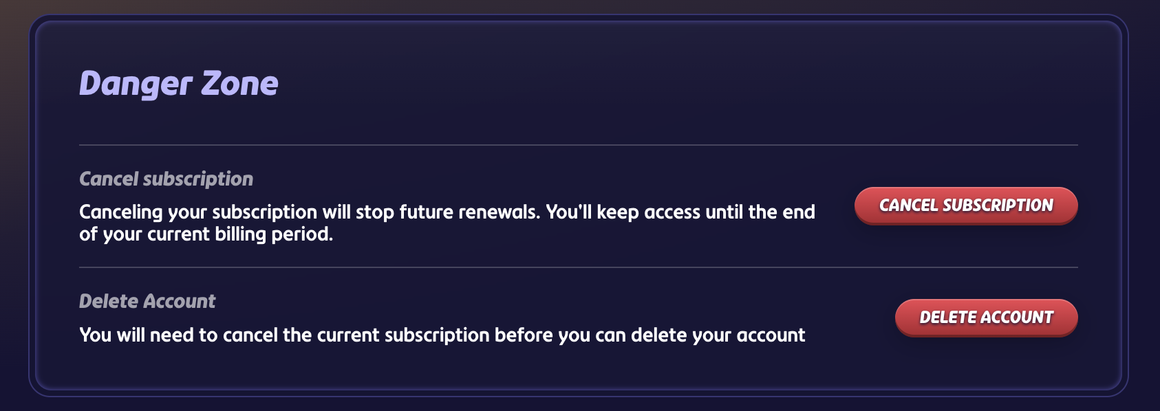 - If you delete your account before canceling your subscription, your subscription will continue. Please contact Paddle in that case at help@paddle.com or visit their support site.